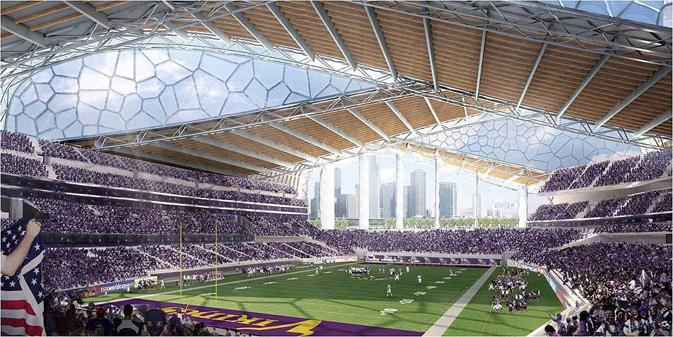 While it bugs me that the design is not symmetrical, if done right, it could look really cool and kind of futuristic in downtown Minneapolis. The natural light coming in through the roof is cool, and it allows the team to play through a snow storm. Let's just home the roof can support the weight.